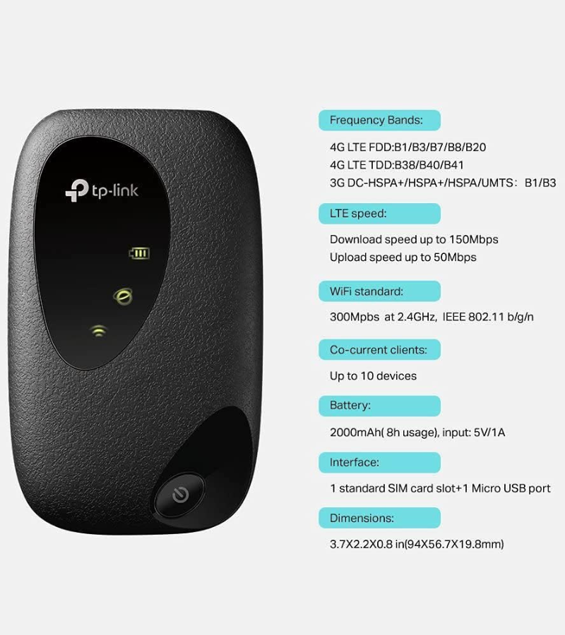 Stay connected anytime, anywhere with the TP-Link M7000 4G+ MiFi Portable Wi-Fi Router. This compact and powerful mobile hotspot supports high-speed 4G+ LTE connectivity, allowing you to share your internet connection with multiple devices simultaneously. Perfect for travel, business, remote work, and home use.
